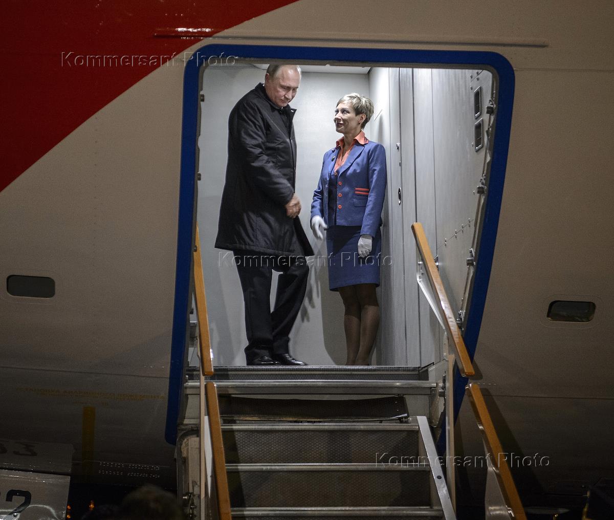 Рабочая поездка президента России Владимира Путина в Турцию. Президент России Владимир Путин после окончания полета выходит из самолета.