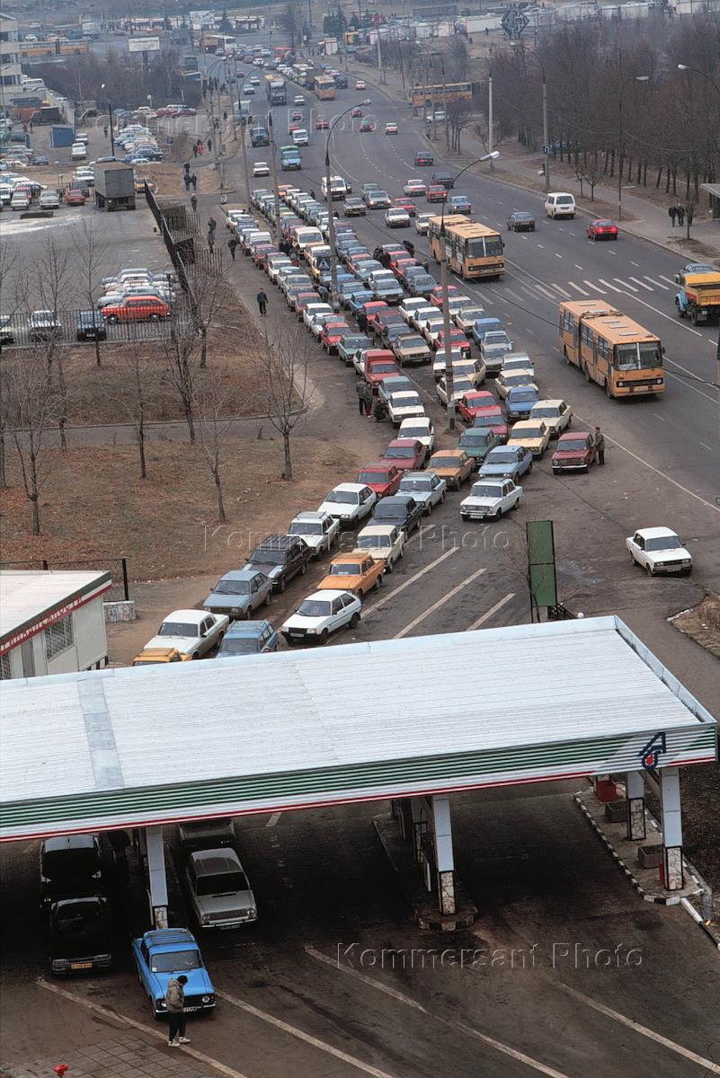 Cars line up for gasoline at a station in Moscow as a result of fuel shortages.