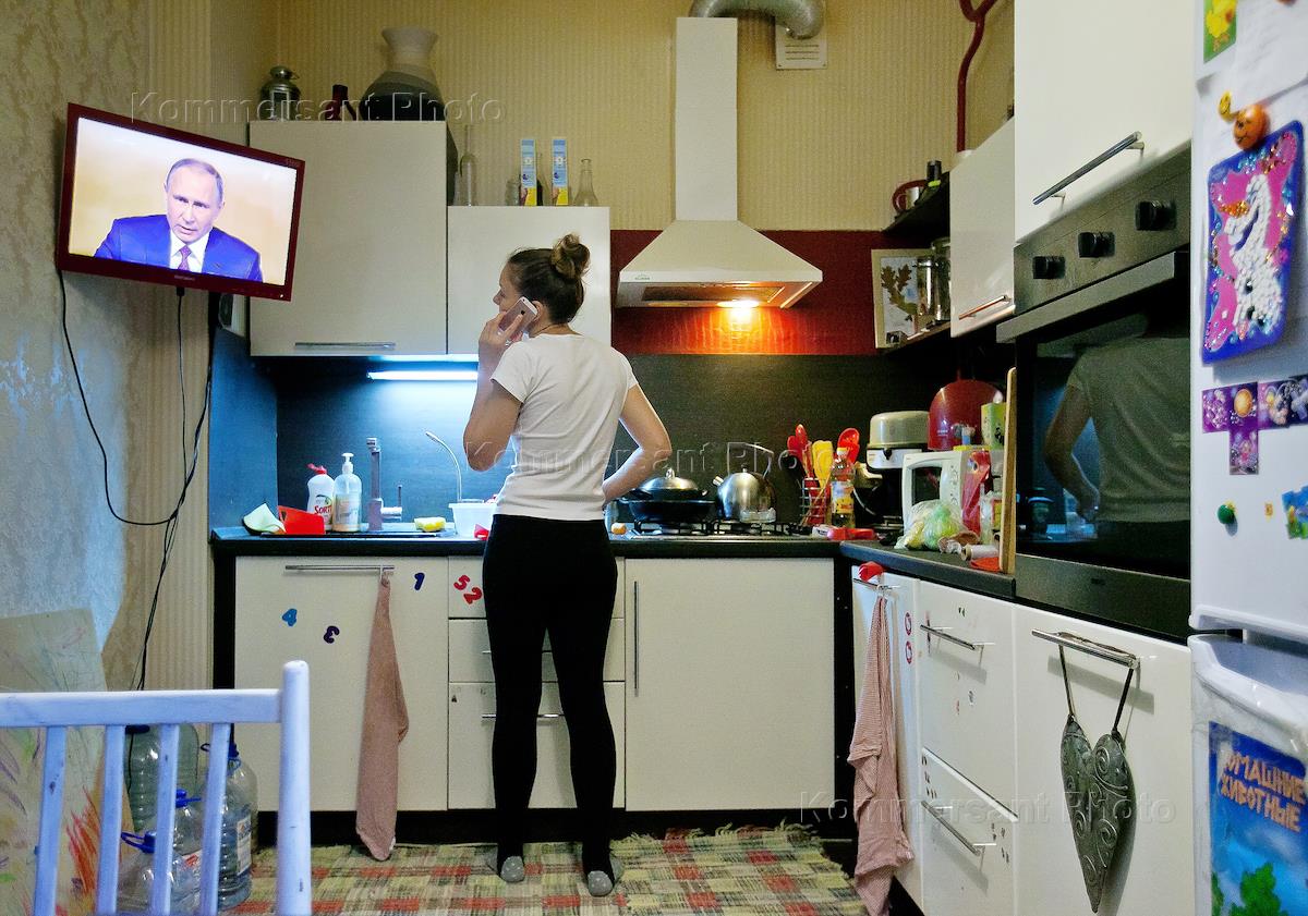 Трансляция ежегодной большой пресс-конференции президента России Владимира Путина на экране телевизора в одной из частных квартир.