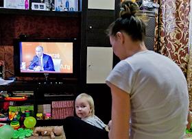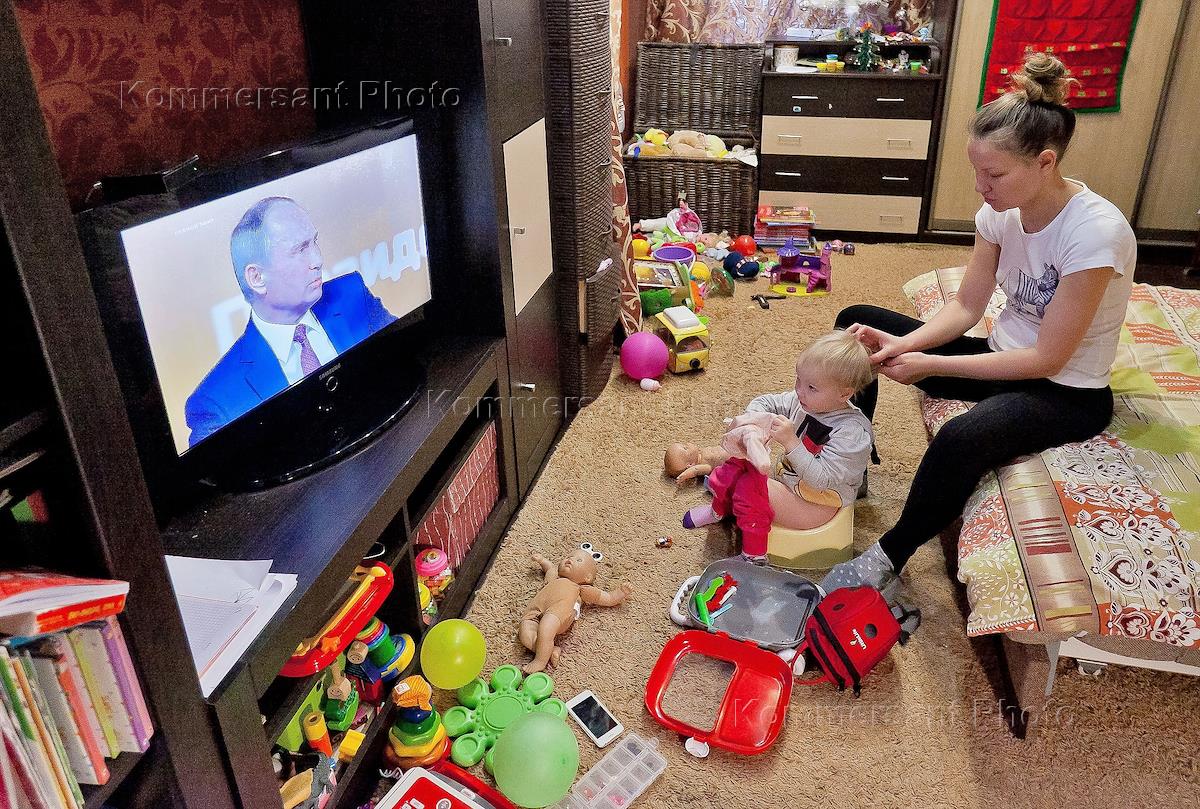 Трансляция ежегодной большой пресс-конференции президента России Владимира Путина на экране телевизора в одной из частных квартир.