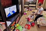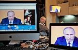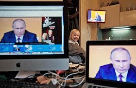 Трансляция ежегодной большой пресс-конференции президента России Владимира Путина на экранах компьютера и телевизоров в одной из частных квартир.