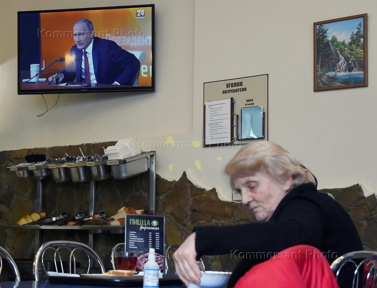 Трансляция ежегодной большой пресс-конференции президента России Владимира Путина. Телевизионный экран в столовой.