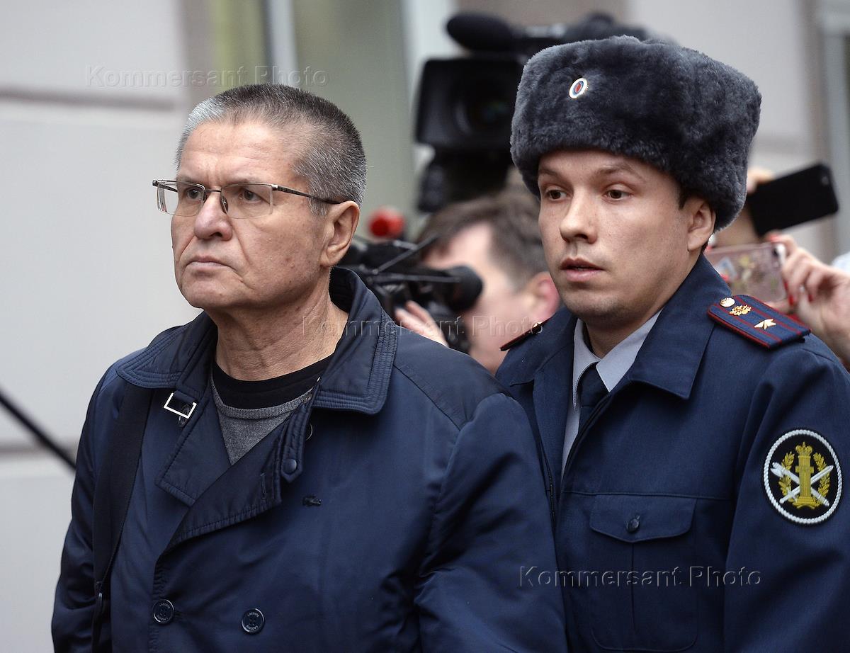 Бывший министр экономического развития России Алексей Улюкаев (справа), обвиняемый в получении взятки в два миллиона долларов, перед оглашением приговора в Замоскворецком районном суде.