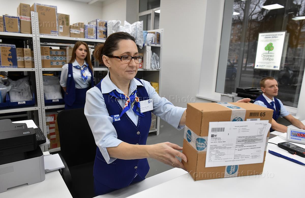 Церемония открытия почтового отделения нового формата ФГУП "Почта России". Сотрудник почты во время работы.