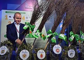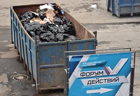 "Форум действий" Общероссийского народного фронта (ОНФ) в международном выставочном центре "Крокус Экспо". Жанровая фотография. Контейнер с мусором на площадке перед афишей форума.