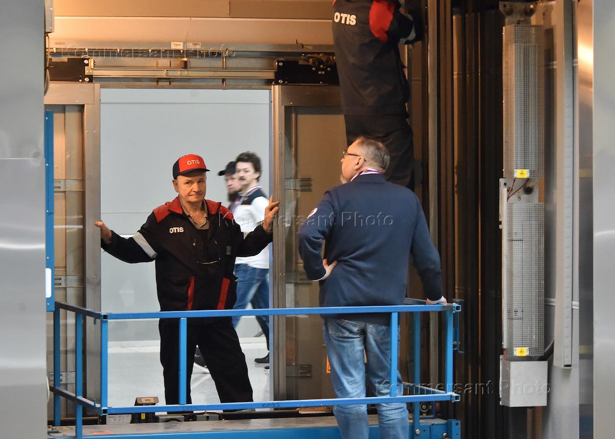 Жанровая фотография. Рабочие во время ремонта лифта в международном выставочном центре "Крокус Экспо".