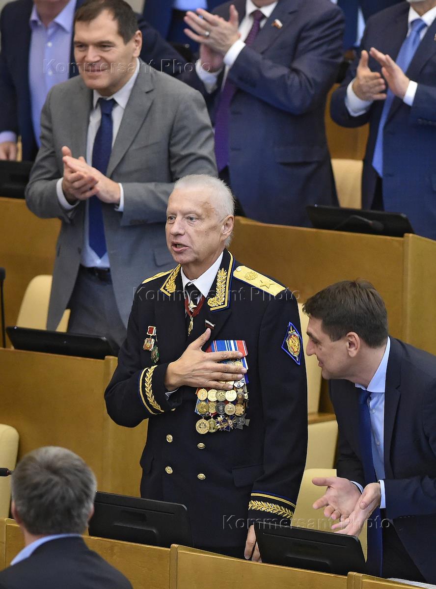 Пленарное заседание Государственной думы (ГД) России. Заместитель директора Федеральной службы войск национальной гвардии России – главнокомандующего войсками национальной гвардии России Сергей Лебедев (слева) во время заседания.