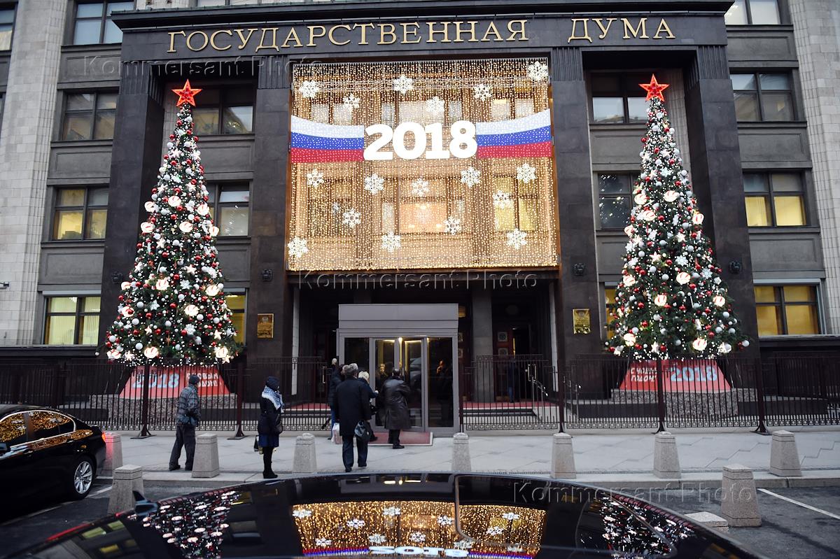 Жанровая фотография. Здание Государственной думы России в новогоднем оформлении.