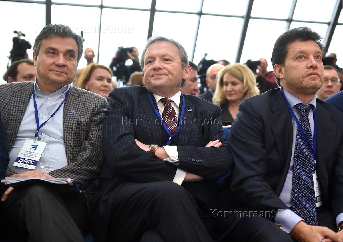 Предвыборный съезд "Партии Роста" в центре международной торговли (ЦМТ). Слева направо: профессор Высшей школы экономики, заместитель председателя "Партии Роста" Владимир Сенин, заместитель председателя "Партии Роста" Виктор Звагельский и уполномоченный при президенте России по защите прав предпринимателей, председатель "Партии Роста" Борис Титов во время съезда.
