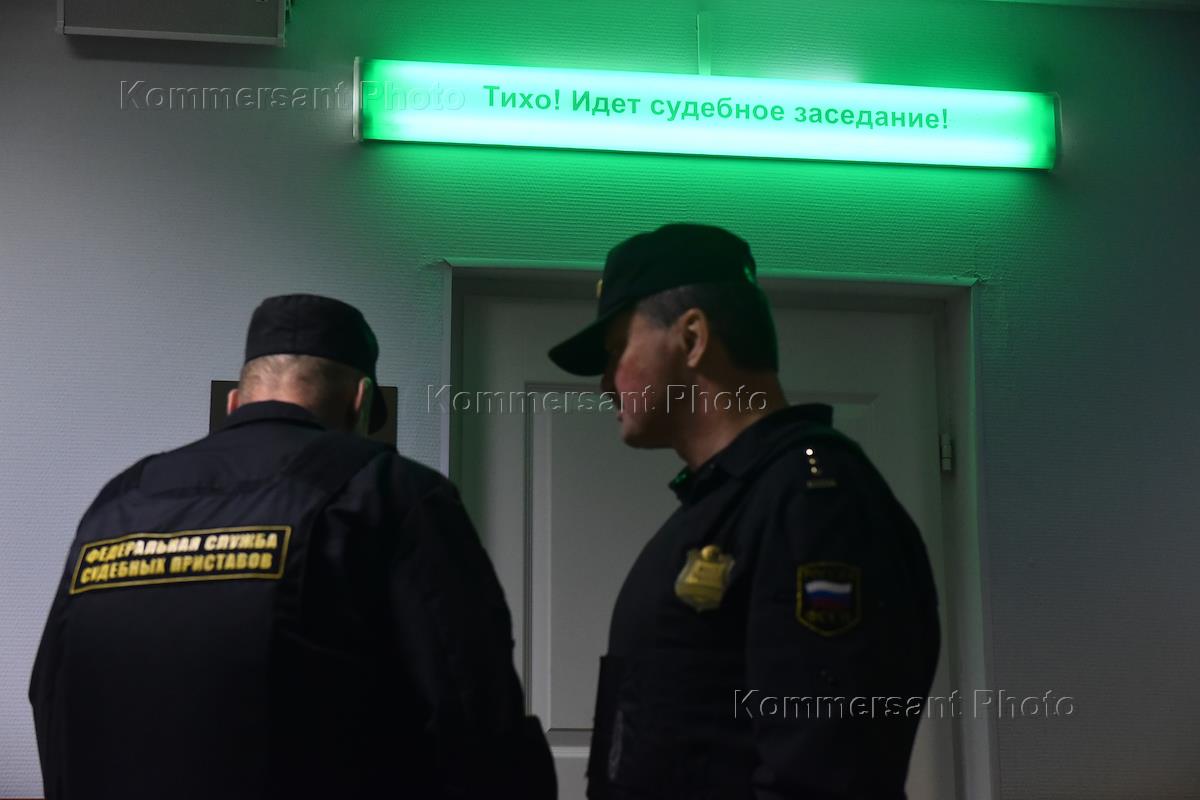 Сотрудники Федеральной службы судебных приставов в здании Ленинградского окружного военного суда. Световое табло на дверью с надписью "Тихо! Идет судебное заседания!".