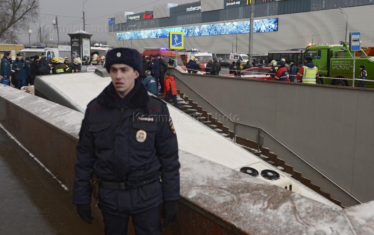 Сотрудники полиции на месте ДТП с автобусом на Славянском бульваре. Автобус одинцовской транспортной компании съехал в подземный переход станции "Славянский бульвар". В результате случившегося, погибли от четырех до пяти человек, около 15 пострадали.