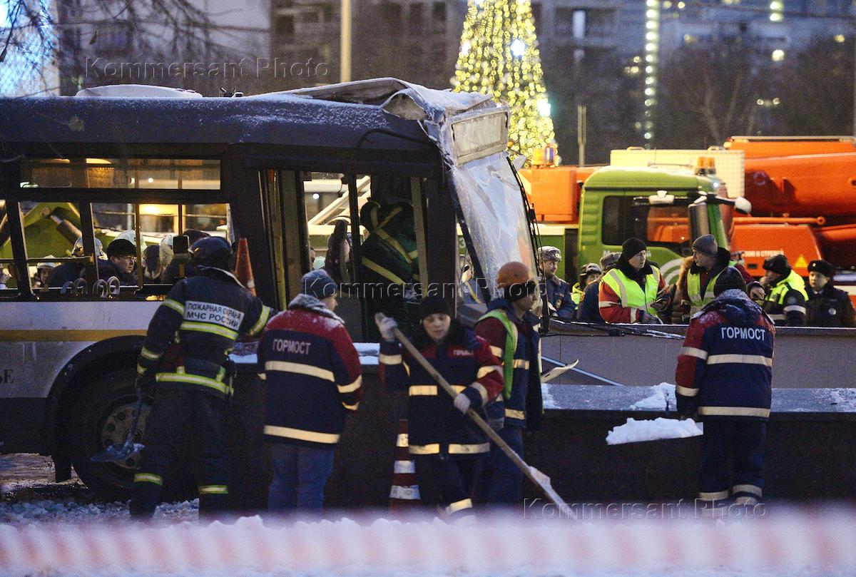 Сотрудники МЧС России и полиции на месте ДТП с автобусом на Славянском бульваре. Автобус одинцовской транспортной компании съехал в подземный переход станции "Славянский бульвар". В результате случившегося, погибли от четырех до пяти человек, около 15 пострадали.