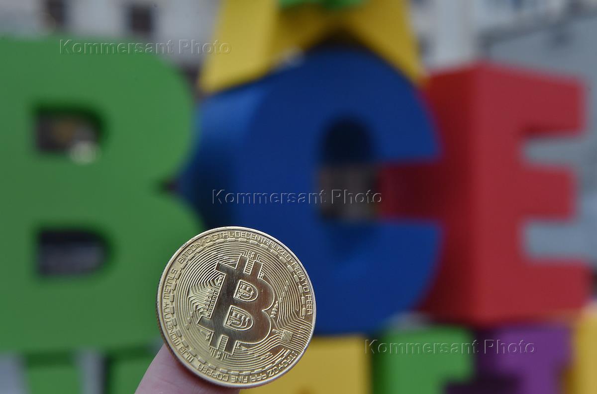 Жанровая фотография. Монеты криптовалюты биткойн (bitcoin) на фоне Кремля.