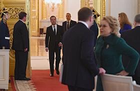 Заседание Государственного совета по вопросам повышения инвестиционной привлекательности регионов прошло в Кремле. Слева направо: председатель правительства России Дмитрий Медведев, президент России Владимир Путин и председатель Совета Федерации России Валентина Матвиенко перед началом заседания.