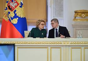 Заседание Государственного совета по вопросам повышения инвестиционной привлекательности регионов прошло в Кремле. Председатель Совета Федерации России Валентина Матвиенко (слева) и генеральный прокурор России Юрий Чайка (справа) перед началом заседания.