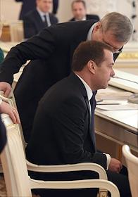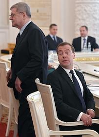 Заседание Государственного совета по вопросам повышения инвестиционной привлекательности регионов прошло в Кремле. Генеральный прокурор России Юрий Чайка (слева) и председатель правительства России Дмитрий Медведев (справа) перед началом заседания.