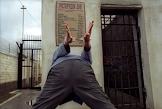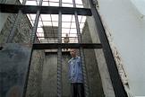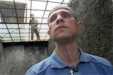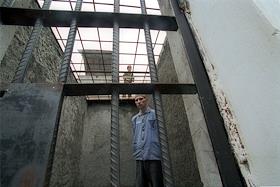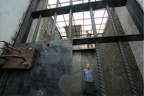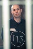 Надзиратель наблюдает сквозь решетку за заключенным во время прогулки в зоне пожизненного заключения.