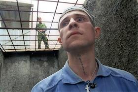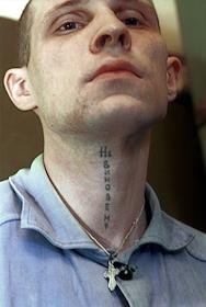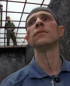 Заключенный во время прогулки в зоне пожизненного заключения. Татуировка на шее "Не виновен!".