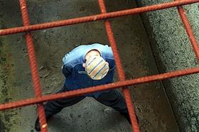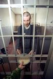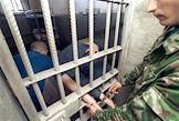 Зона для пожизненного заключения. Охранник надевает наручники заключенным через решетку.
