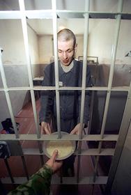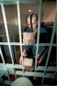 Заключенный получает пайку хлеба через прорезь решетки в зоне для пожизненного заключения.