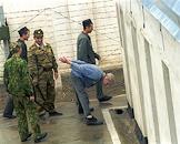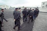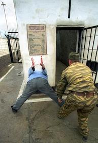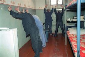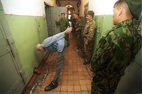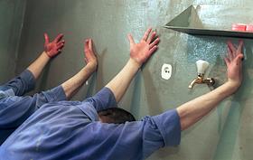 Надзиратели с резиновыми дубинками во время досмотра заключенного в зоне для пожизненно заключенных.