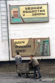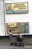 Заключенные везут тележку. Настенная агитация на территории лагеря для пожизненного заключения.
