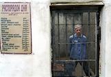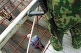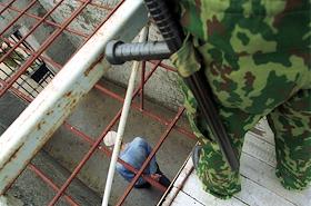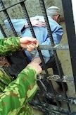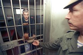 Заключенный получает свой паек от охранника через прорезь решетки в лагере пожизненного заключения.