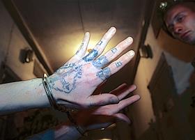 Руки заключенного в наручниках и в наколках в зоне пожизненного заключения.