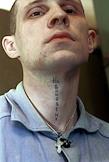 Заключенный с крестом и татуировкой "невиновен" на шее в зоне пожизненного заключения.