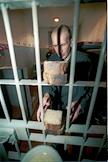 Заключенный сквозь решетку получает свой паек хлеба в зоне для пожизненно заключенных.