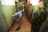 Заключенный стоит перед надзирателем во время досмотра в зоне пожизненного заключения.