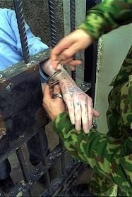 Надзиратель надевает наручники на заключенного сквозь решетку в лагере пожизненного заключения.