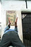 Заключенный стоит за решеткой, на стене висит распорядок дня для зоны пожизненного заключения.