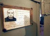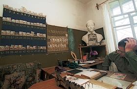 Дежурный офицер в комнате за рабочим столом в зоне для пожизненно заключенных. В углу дежурной комнаты стоит бюст Феликса Эдмундовича Дзержинского, на стене развешана картотека заключенных.