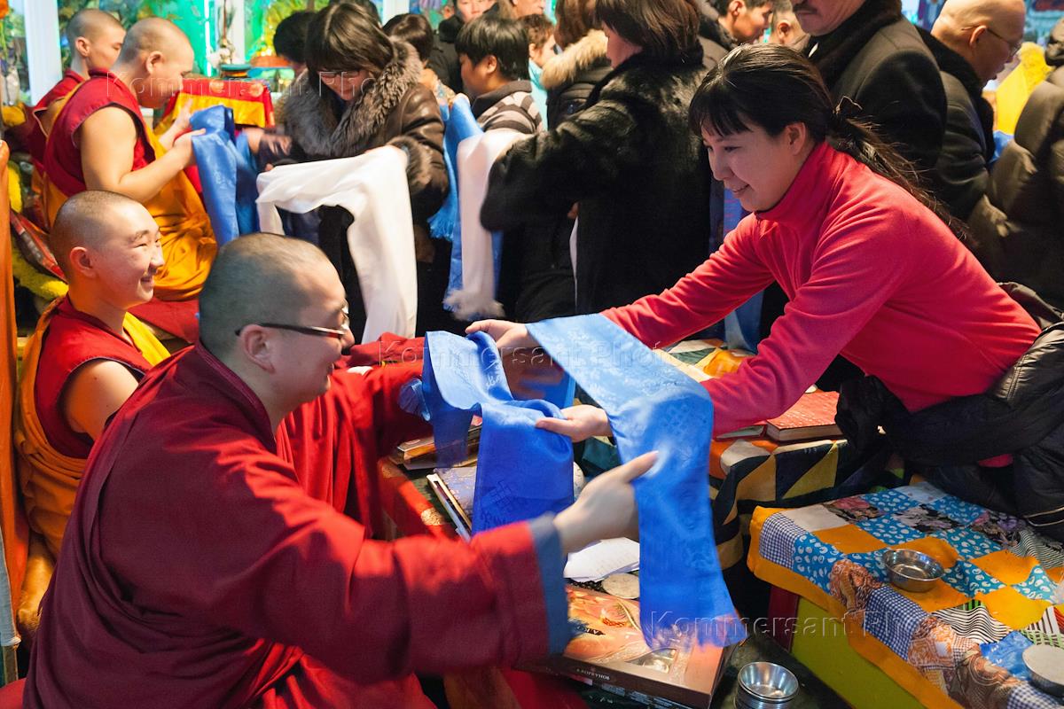 Празднование Сагаалгана (Цагаан сар) в Ацагатском дацане Бурятии. Обмен хадаками - ритуальными шелковыми лоскутами, лентами или шарфами белого, синего или желтого цвета, обозначающими чистоту и бескорыстие.