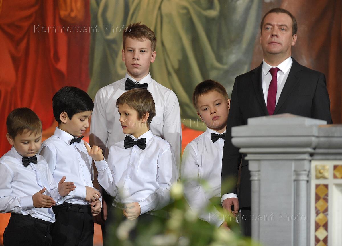 Рождественское богослужение прошло в Кафедральном соборном Храме Христа Спасителя. Председатель Правительства России Дмитрий Медведев (справа) во время богослужения.