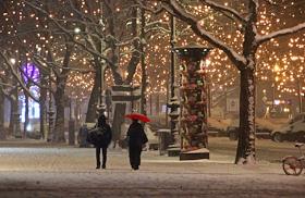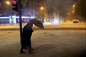Виды Берлина. Снегопад на улице Курфюрстендамм. Пожилая пара под зонтиком.