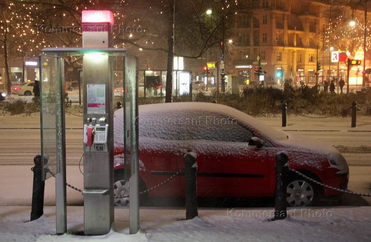 Виды Берлина. Заснеженный автомобиль на улице Курфюрстендамм.