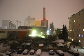 Снегопад на улице Курфюрстендамм, Автобусная остановка. График прибытия автобусов.