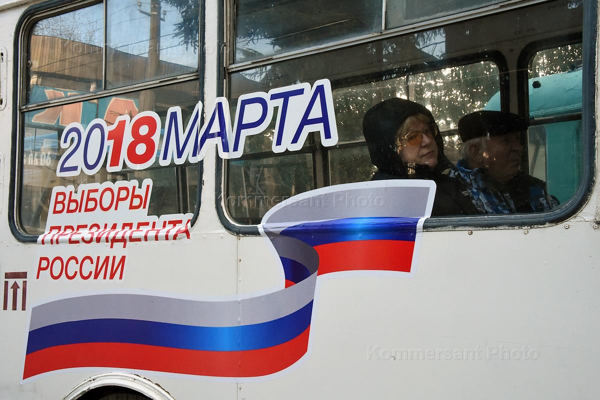 Избирательная кампания выборов президента России. Эмблема выборов на городском пассажирском автобусе.