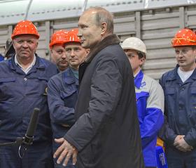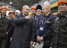 Рабочая поездка президента России Владимира Путина в Тверскую область. Президент России Владимир Путин (в центре) и генеральный директор ОАО "Тверской вагоностроительный завод" Андрей Соловей (слева) во время встречи с рабочими Тверского вагоностроительного завода.