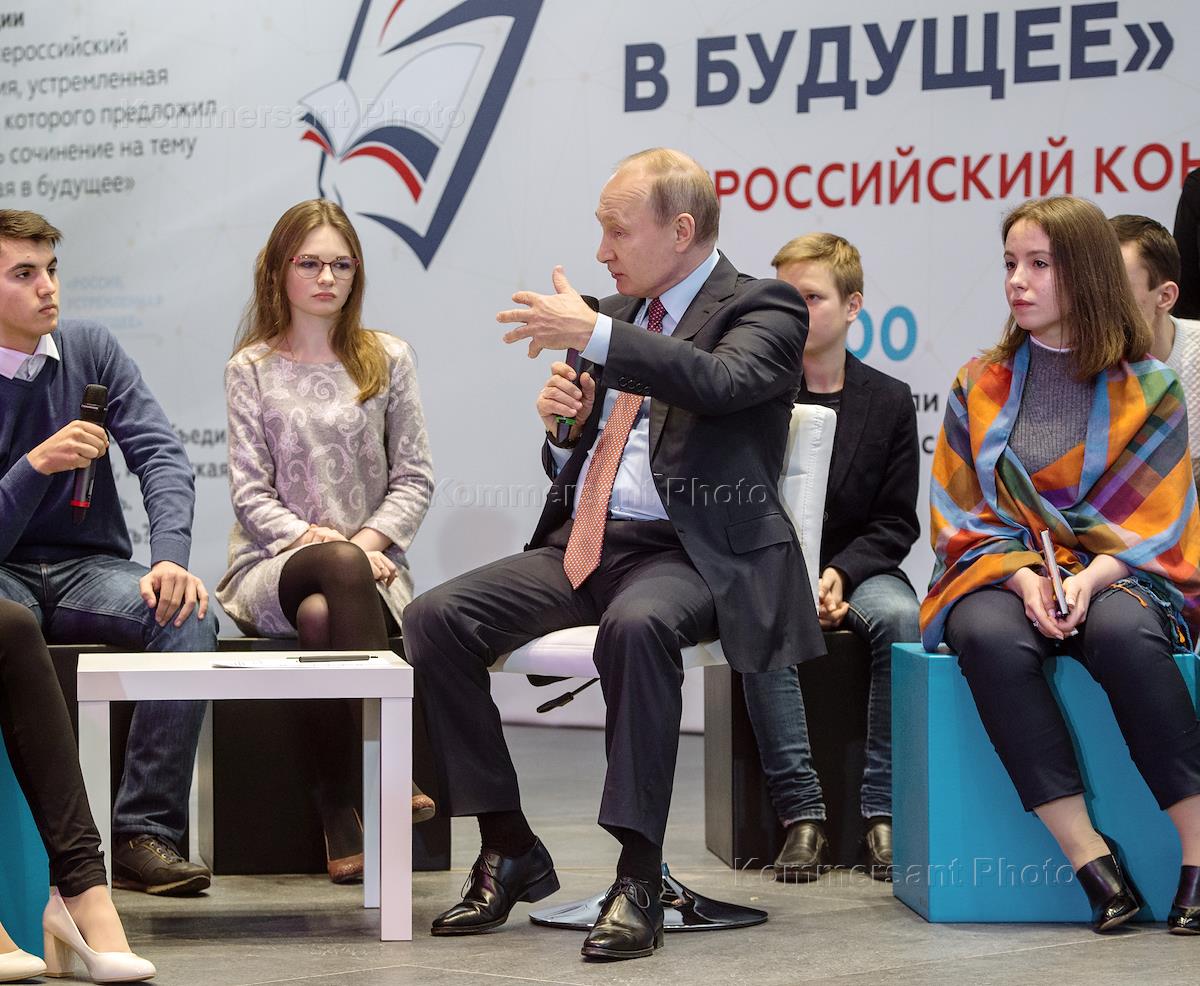Президент России Владимир Путин во время встречи со школьниками – авторами лучших сочинений на тему "Россия, устремленная в будущее". Встреча прошла в парке "Зарядье".