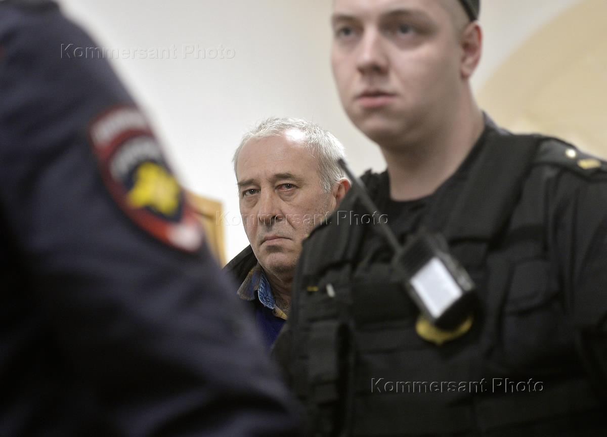 Водитель автобуса Виктор Тихонов (в центре), въехавший в подземный пешеходный переход у станции метро "Славянский бульвар" 25 декабря 2017 года, во время заседания в Басманном суде.
