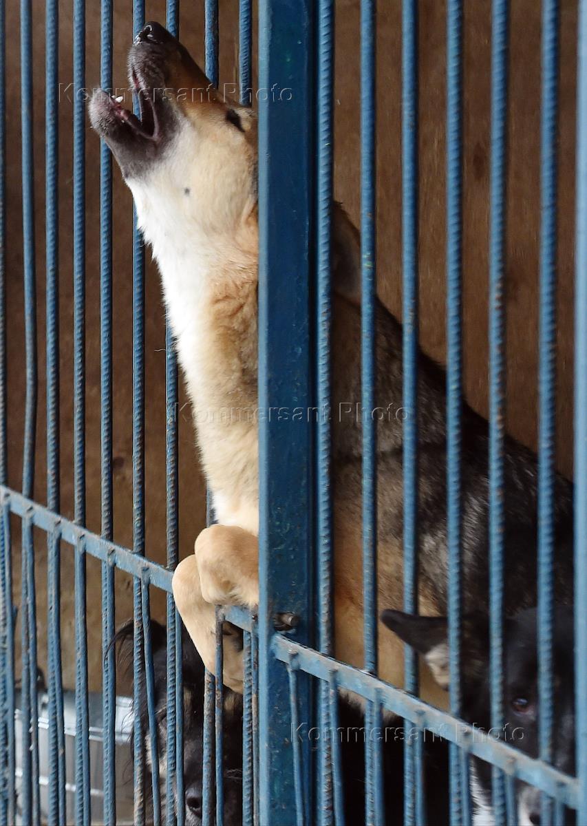 Приют для бездомных собак "Красная сосна". Волонтер во время кормления собак.