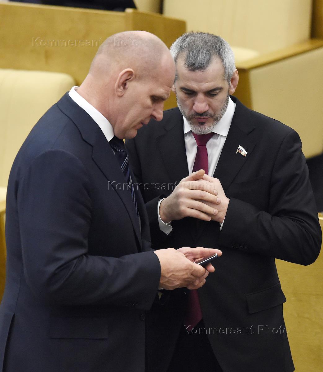 Пленарное заседание Государственной думы (ГД) России. Член комитета ГД России по энергетике Александр Карелин (слева) и член комитета ГД России по физической культуре, спорту, туризму и делам молодежи Бувайсар Сайтиев (справа) во время заседания.
