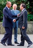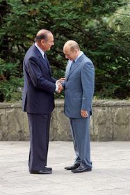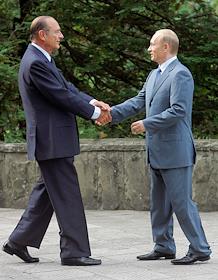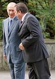 Президент Франции Жак Ширак (слева) и Президент России Владимир Путин (справа) перед началом трехсторонних переговоров между президентами России, Франции, Германии. Переговоры состоялись в резиденции Президента России "Бочаров ручей".