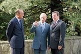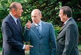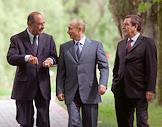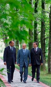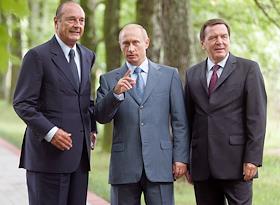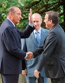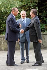 Президент Франции Жак Ширак (в центре), канцлер ФРГ Герхард Шредер (слева) и Президент России Владимир Путин (справа) перед началом трехсторонних переговоров. Переговоры состоялись в резиденции Президента России "Бочаров ручей".