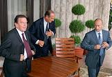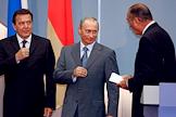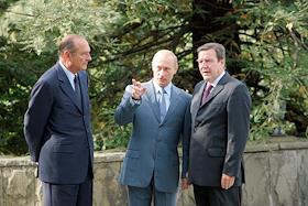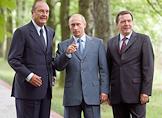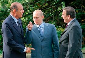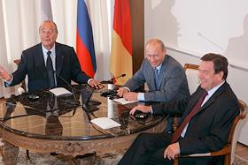 Канцлер ФРГ Герхард Шредер (слева), Президент России Владимир Путин (в центре) и президент Франции Жак Ширак (справа) во время трехсторонних переговоров между президентами России, Франции, Германии. Переговоры состоялись в резиденции Президента России "Бочаров ручей".