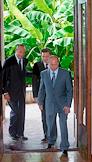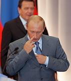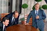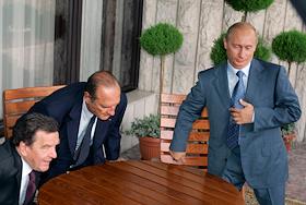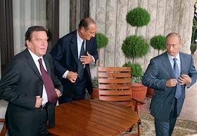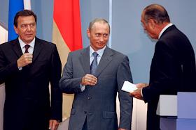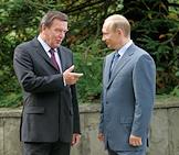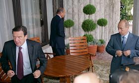 Канцлер ФРГ Герхард Шредер (слева) и Президент России Владимир Путин (справа) во время трехсторонних переговоров. Переговоры состоялись в резиденции Президента России "Бочаров ручей".