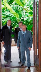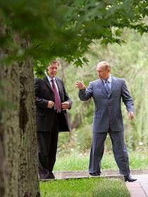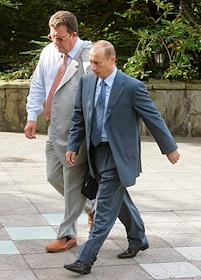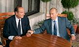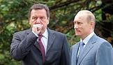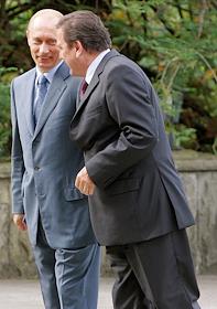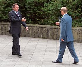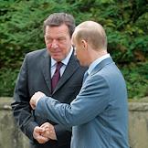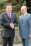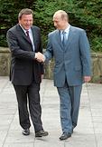 Канцлер ФРГ Герхард Шредер (справа) и Президент России Владимир Путин (слева) перед началом трехсторонних переговоров между президентами России, Франции, Германии. Переговоры состоялись в резиденции Президента России "Бочаров ручей".